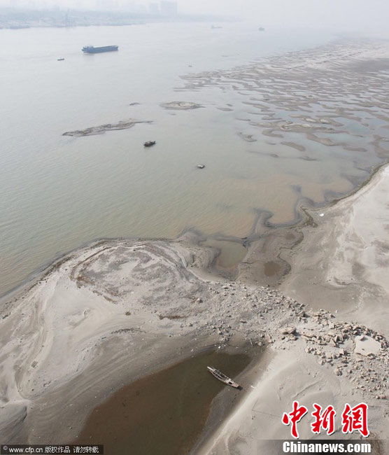 12月7日,在長江武漢市天興洲水域,大量沙洲露出江面,形成大大小小的沙丘,分布在水岸。據(jù)悉,近期,由于長江中下游地區(qū)持續(xù)多日的干燥少雨的天氣,長江漢口水位接近枯水期的標(biāo)植。